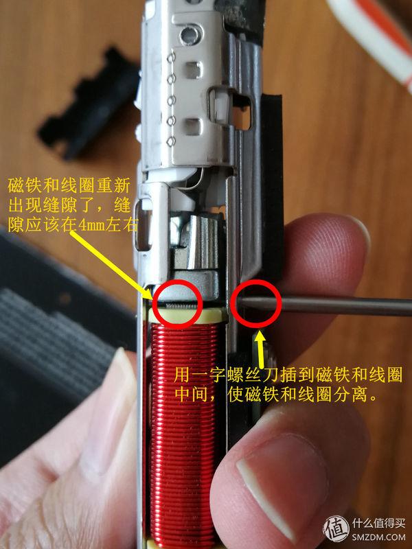 ▼松开固定螺丝后,还是用小的一字口螺丝刀,插入线圈和磁铁中间,将线圈和磁铁分开。间隙保持在4mm左右,可以试验着调整。之后锁死固定螺丝就OK了