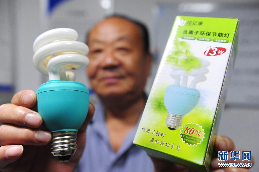 9月24日,陈怀银老人展示自己发明的负离子环保节能灯。