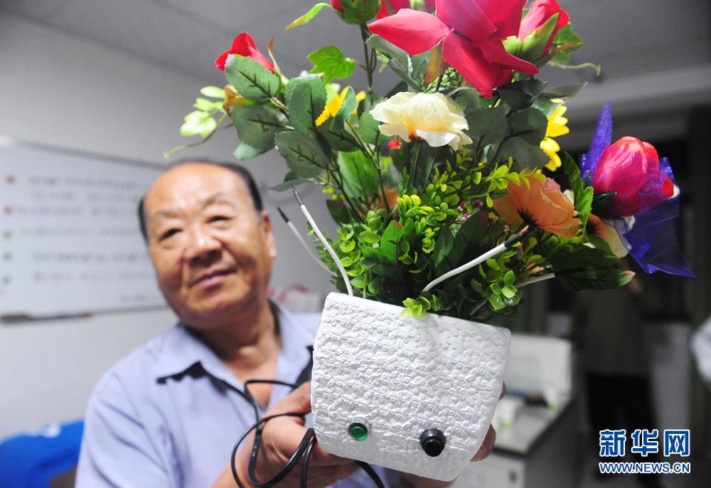 9月24日,陈怀银老人展示发明的仿真盆花空气净化器。