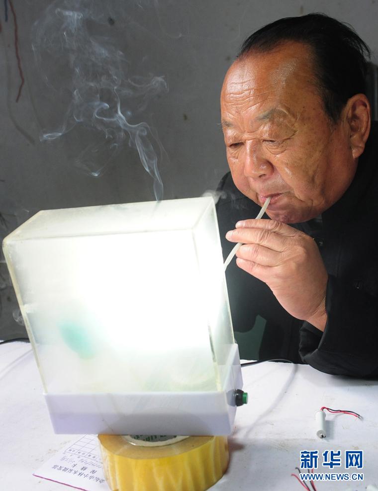 10月19日,陈怀银老人将烟用嘴吹进灯罩内为负离子环保节能灯做实验。