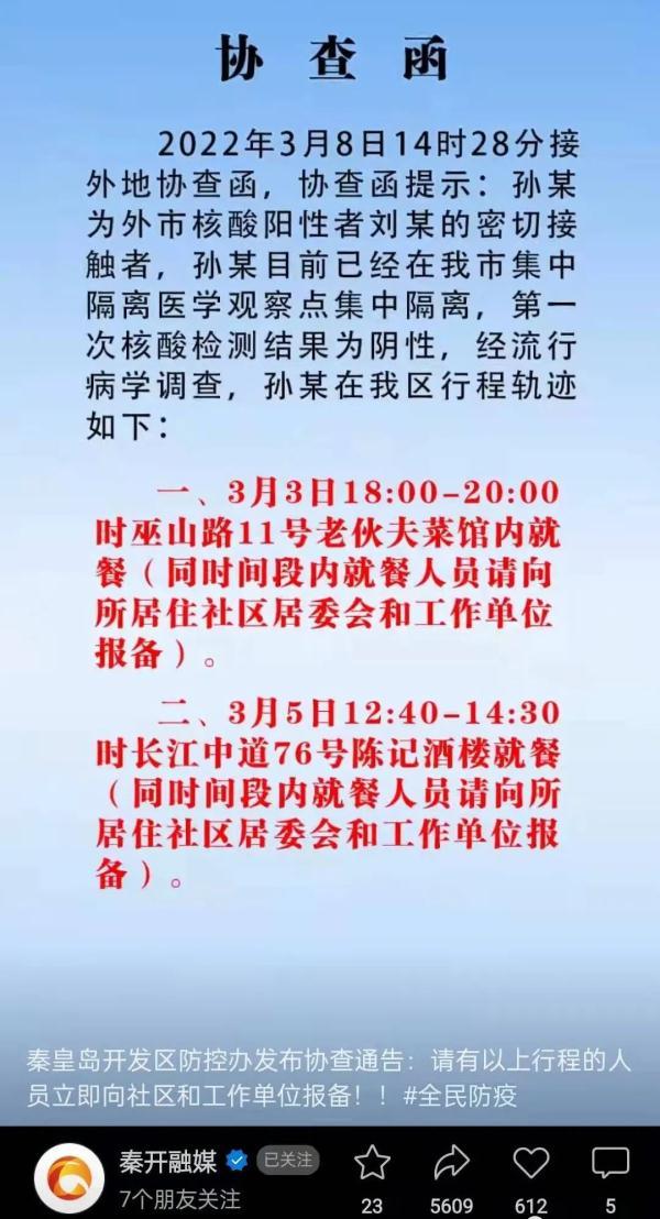 秦皇岛开发区防控办发布协查通告: