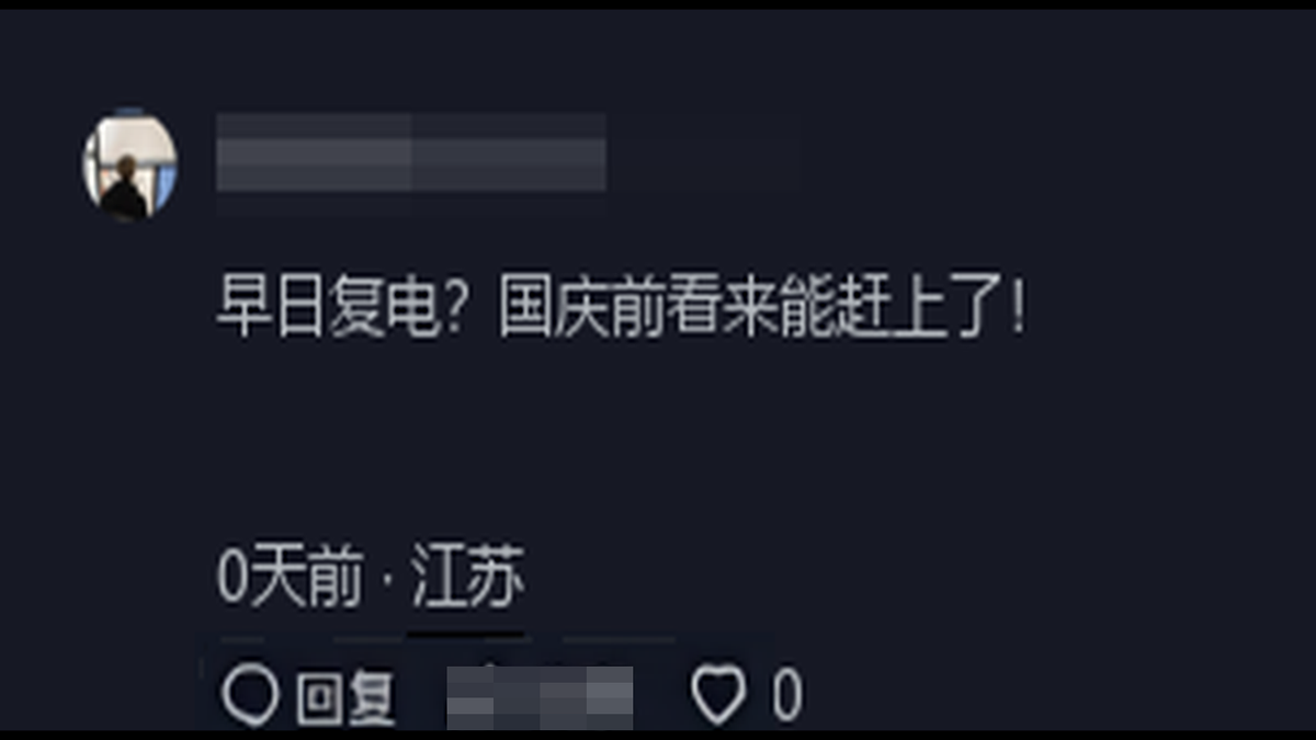 ‘早日复电?国庆前看来能赶上了!’ 这句略带讽刺的评论,透露出市民对恢复供电时间的不确定感和对现状的无奈。