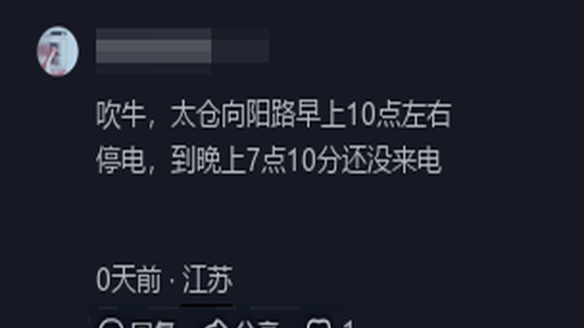 网友调侃中带着焦急:'吹牛,太仓向阳路早上10点左右停电,到晚上7点10分还没来电。' 这句评论反映了部分区域恢复供电的滞后情况,让人感受到市民对电力供应的迫切需求。