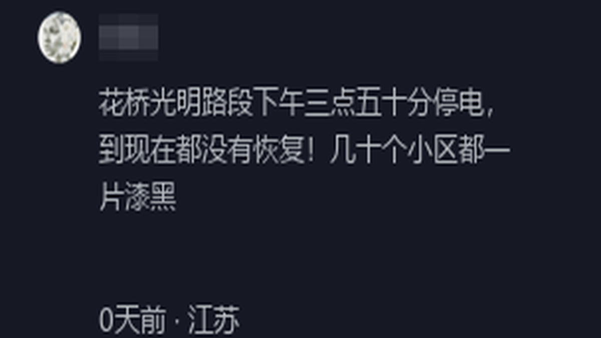 '花桥光明路段下午三点五十分停电,到现在都没有恢复!几十个小区都一片漆黑。' 这句评论生动描绘了停电给多个社区带来的黑暗与不便,也反映了抢修工作的艰巨性。