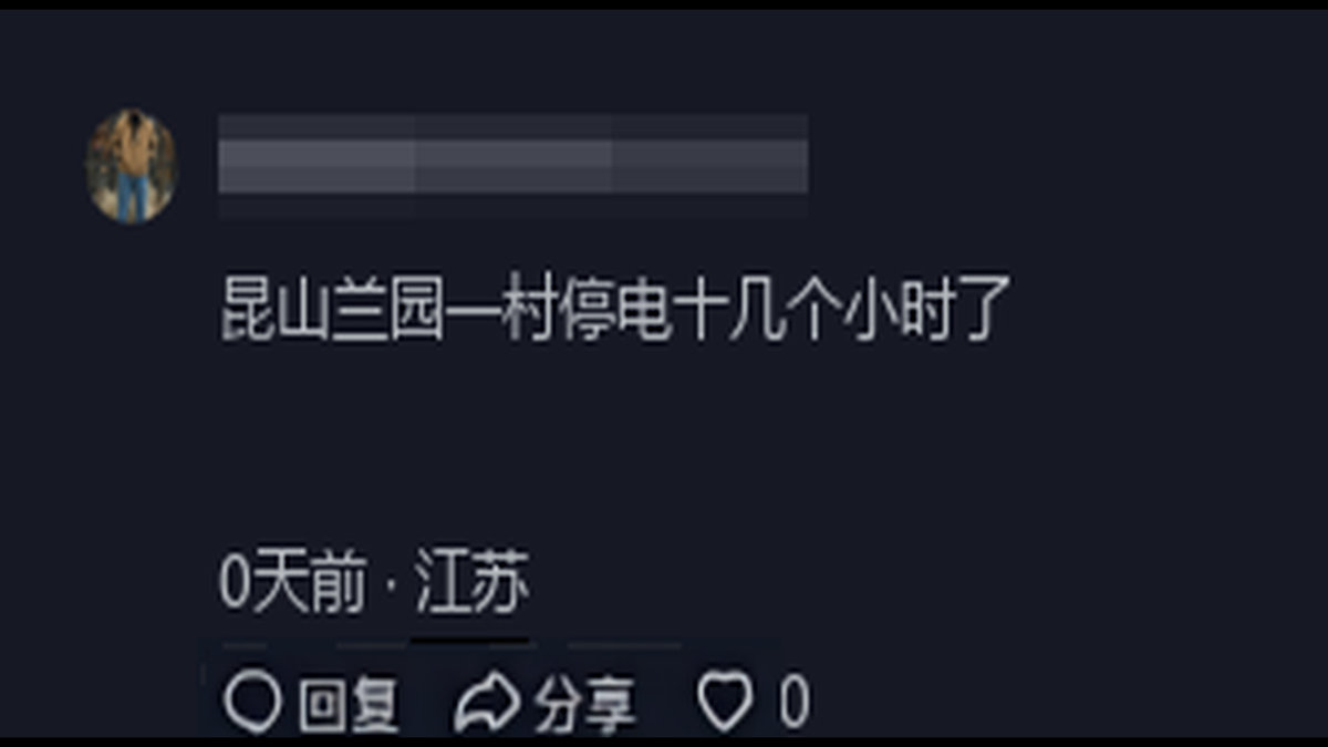 昆山兰园一村的居民则直接表达了不满:'停电十几个小时了',长时间的停电无疑给他们的生活带来了极大不便。