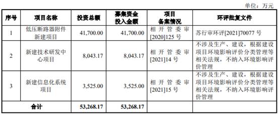 公司拟募集资金53,268.17万元,分别用于低压断路器附件新建项目、新建技术研发中心项目、新建信息化系统项目。
