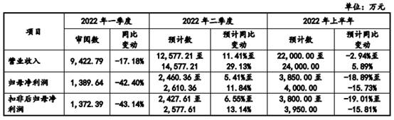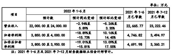 2022年1-6月,公司预计营业收入为22,000.00万元至24,000.00万元,同比变动-2.94%至5.89%;预计归母净利润3,850.00万元至4,000.00万元,同比变动-18.89%至-15.73%;预计扣非后归母净利润3,800.00万元至3,950.00万元,同比变动-19.01%至-15.81%。