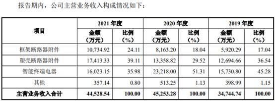 智能终端电器2021年收入下滑明显。2019年至2021年,智能终端电器收入分别为15,730.80万元、23,218.00万元和16,023.15万元,占主营业务收入比例分别为45.28%、51.31%、35.98%,2019年、2020年连续两年贡献收入最高。