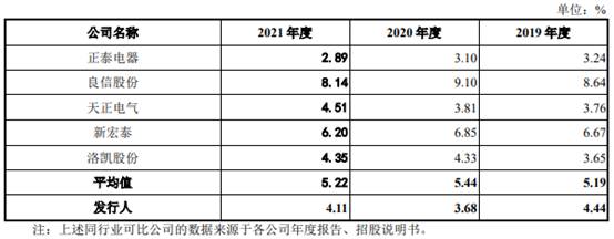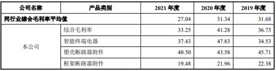 翻阅招股书发现,未来电器的主营业务毛利率在同一版招股书中出现数据打架的情况。在毛利率下降的风险提示中,未来电器表示,报告期各期,公司主营业务毛利率分别为36.51%、41.08%和33.30%。而在主营业务毛利率分析部分,未来电器主营业务毛利率分别为36.51%、41.77%和34.09%。可见,未来电器在2019年的主营业务毛利率一致,而2020年及2021年该数据出现差异。
