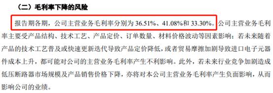 在毛利率下降的风险提示中,未来电器表示,报告期各期,公司主营业务毛利率分别为36.51%、41.08%和33.30%。公司主营业务毛利率主要受产品结构、技术工艺、产品定价、订单数量、材料价格波动等因素影响;若未来随着产品的技术工艺普及或快速更新迭代导致产品定价降低,或者贸易摩擦加剧导致进口电子元器件成本上升,都可能对公司的主营业务毛利率产生不利影响。此外,若未来行业竞争加剧造成低压断路器市场规模及产品销售价格下降,亦将对本公司主营业务毛利率产生负面影响,从而影响公司的业绩。