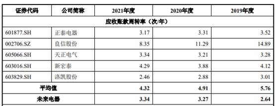 未来电器应收账款周转率、存货周转率均低于行业均值。报告期各期末,未来电器应收账款(含合同资产)账面余额分别为13,927.14万元、13,631.75万元和12,345.90万元,占营业收入比例分别为39.66%、30.92%、28.86%。2019年至2021年,公司应收账款周转率分别为2.64次/年、3.27次/年、3.34次/年,低于同行业可比公司均值5.76次/年、4.91次/年、4.32次/年。