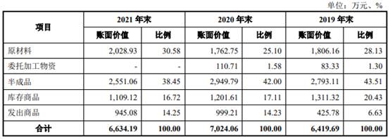 报告期各期末,公司原材料账面价值分别为1,806.16万元、1,762.75万元和2,028.93万元,占存货账面价值的比例分别为28.13%、25.10%和30.58%;半成品账面价值分别为2,793.11万元、2,949.79万元和2,551.06万元,占存货的比例分别为43.51%、42.00%和38.45%