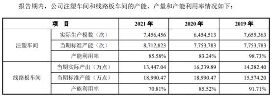 2019年至2021年,公司注塑车间产能利用率分别为98.73%、83.24%、85.58%,线路板车间产能利用率为91.71%、85.52%、70.81%。