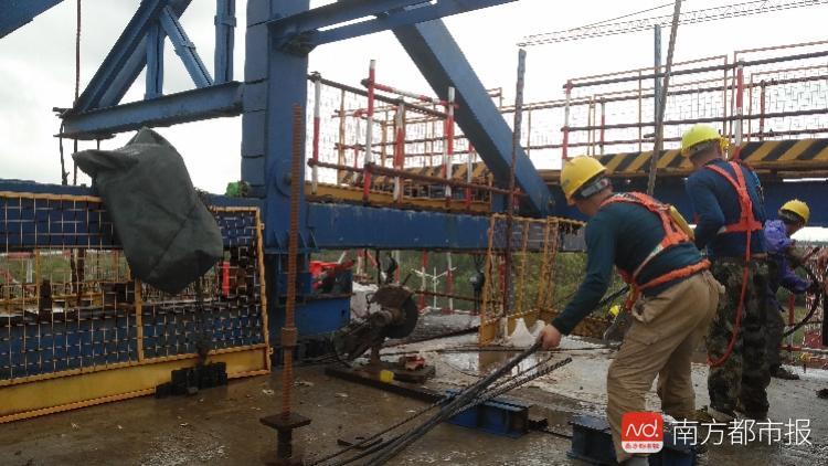 日前,记者驱车来到位于博罗县石湾镇的广汕铁路跨永石大道特大桥建设现场,看到工人师傅们正在进行架梁施工。