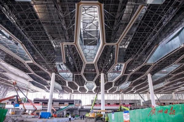 增城区新塘镇,走进正在紧锣密鼓加紧建设的新塘站站房大厅,抬头望去,只见几名工人正在近20米的高空安装天花板异形膜结构吊顶,这是一种新型装饰材料透光膜,有着极好的透光性,并能配合灯光营造梦幻效果。