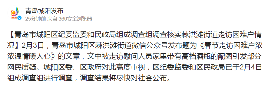 【青岛市城阳区纪委监委和民政局组成调查组调查核实棘洪滩街道走访困难户情况】2月3日,青岛市城阳区棘洪滩街道微信公众号发布题为《春节走访困难户浓浓温情暖人心》的文章,文中被走访慰问人员家里带有高档酒瓶的配图引发部分网民质疑。城阳区委、区政府对此高度重视,区纪委监委和区民政局已于2月4日组成调查组进行调查,调查结果将尽快对社会公布。