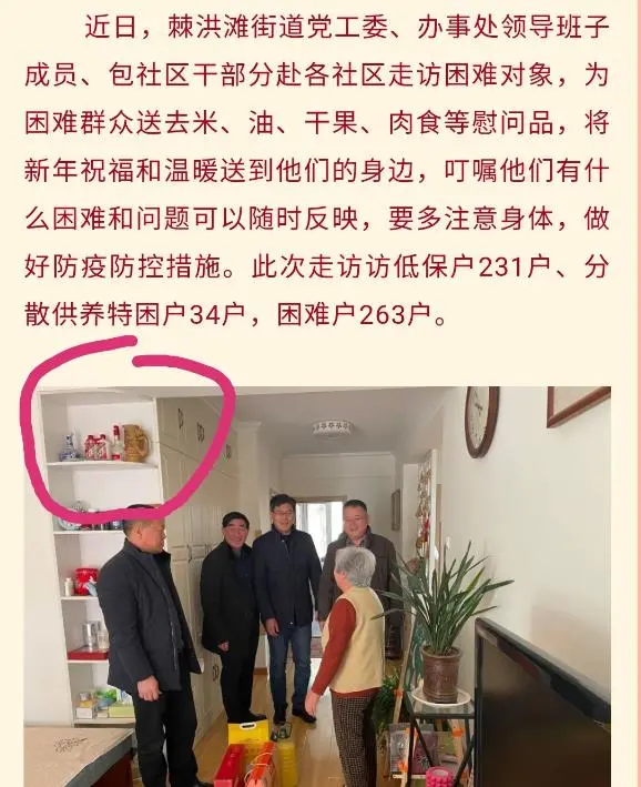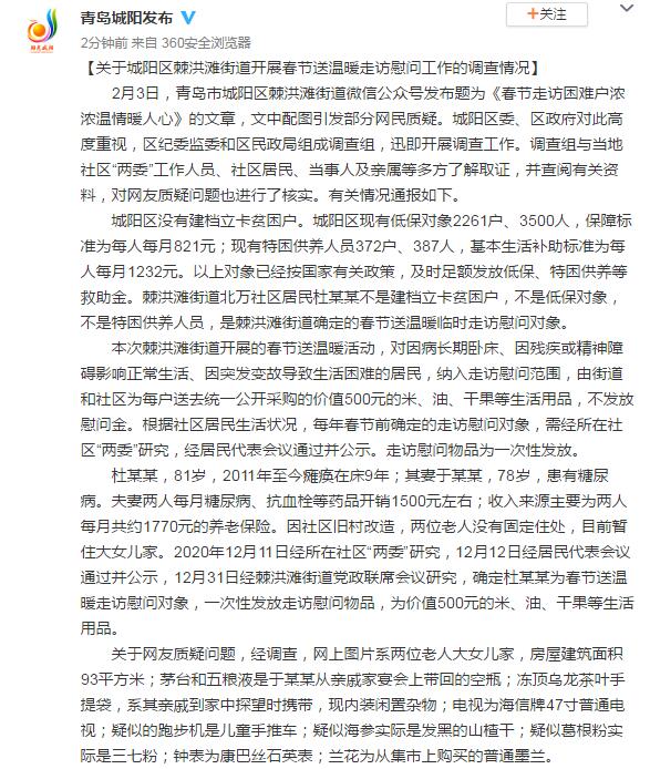 2月3日,青岛市城阳区棘洪滩街道微信公众号发布题为《春节走访困难户浓浓温情暖人心》的文章,文中配图引发部分网民质疑。城阳区委、区政府对此高度重视,区纪委监委和区民政局组成调查组,迅即开展调查工作。调查组与当地社区“两委”工作人员、社区居民、当事人及亲属等多方了解取证,并查阅有关资料,对网友质疑问题也进行了核实。有关情况通报如下。
