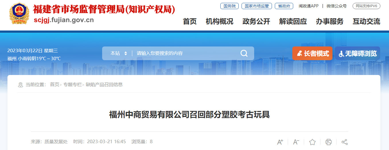 中国质量新闻网讯 据福建省市场监督管理局网站2023年3月21日消息,日前,福州中商贸易有限公司按照《消费品召回管理暂行规定》的要求,向福建省市场监督管理局报告了召回计划,将自即日起,召回2022年5月1日至2022年5月30日期间制造的部分型号规格为MNKL-1005,生产批号为2022-5-1的塑胶考古玩具,涉及数量为16盒。