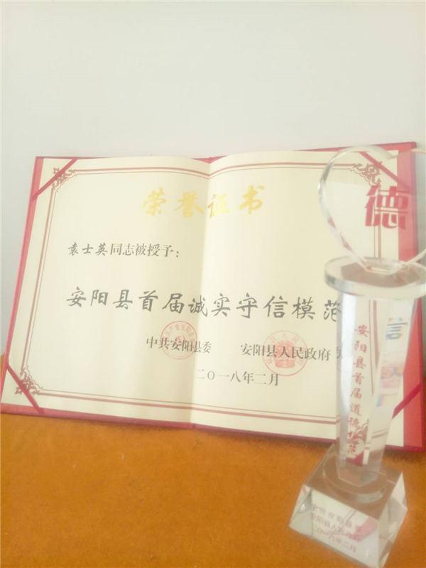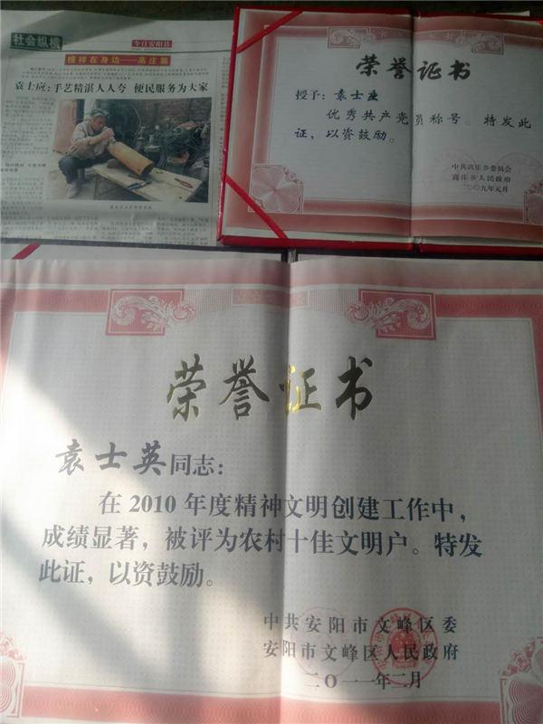 由于平时热心助人,今年2月,袁士英在安阳县(示范区)首届“道德模范”和“文明家庭”评选活动中,被评为诚实守信道德模范。面对金光闪闪的证书,袁士英笑着说:“我做的还不够,以后还会继续努力的。”