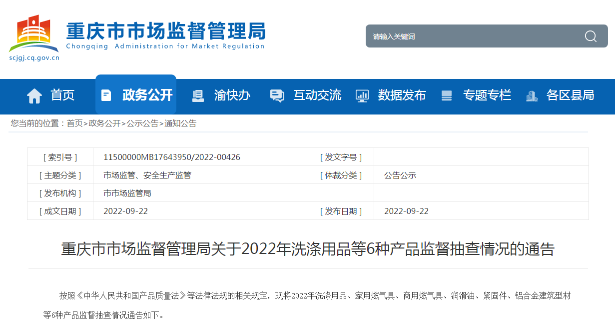 中国质量新闻网讯 9月22日,重庆市市场监督管理局网站发布关于2022年洗涤用品等6种产品监督抽查情况的通告。