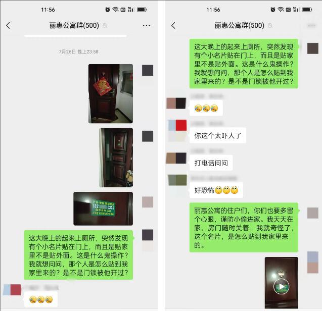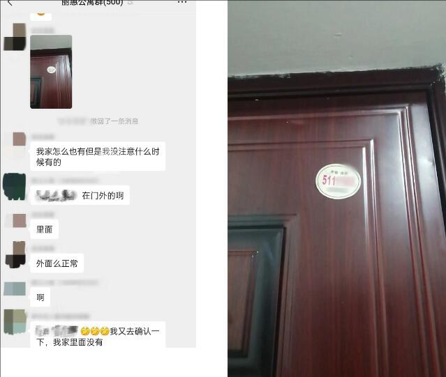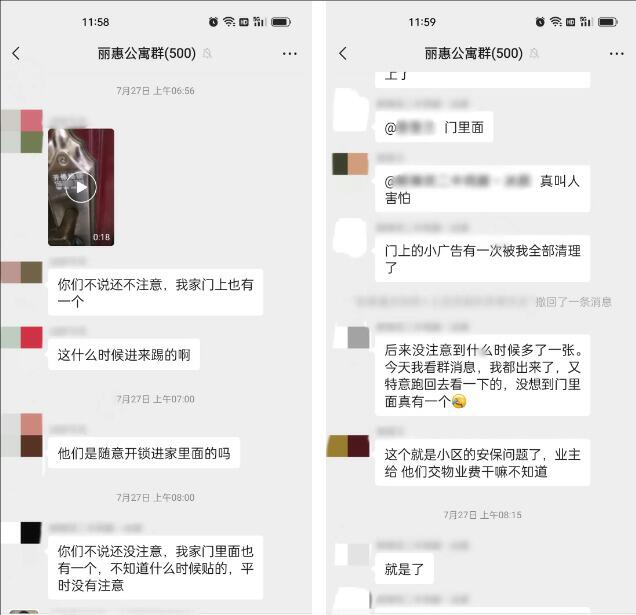 随后,晶晶在小区微信群里分享了这一经历,并提醒邻居们注意安全。结果引发了小区租户们的讨论,不少租户反映家里也被贴了开锁广告。