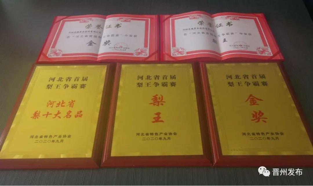 在梨王争霸赛中河北长城果品股份有限公司的鸭梨、河北悦泰农产品加工有限公司的黄冠梨凭借产品果型、果色、重量、硬度、风味、可溶性固形物等多项指标的绝对优势,在全省9大类梨果产品中脱颖而出,喜获2个“梨王”称号,晋州市成为全省获得“梨王”数量最多的县市。