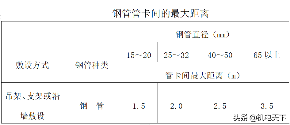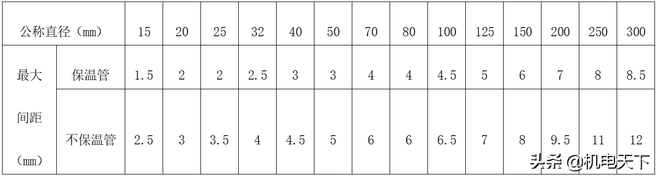 (5)钢管水平安装的支架间距,不得大于下表的规定: