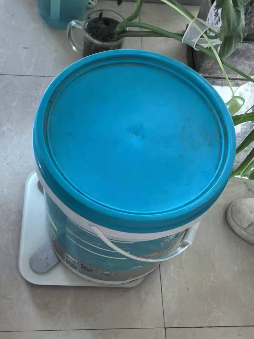 随后,师傅在地板上钻了一个孔,将工具插进去后开始往里面注入材料。大概20分钟后,师傅结束了工作,将桶里的剩余材料再一称,2个桶里的材料只剩10斤重了。