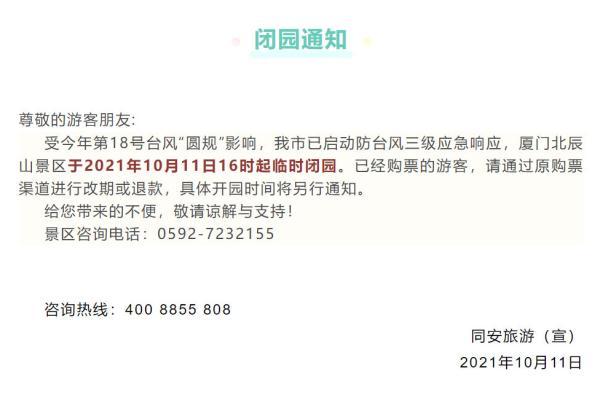 受今年第18号台风“圆规”影响,根据上级部门部署及要求,为确保广大市民游客的人身和财产安全,香山省级风景名胜区将于10月11日20时开始进行闭园。同时景区内商户、游客疏散至安全区域,及时切断户外电源。请广大市民游客给予理解和支持,另行安排在厦旅游行程,并注意台风动态,确保旅游安全,开园时间另行通知。