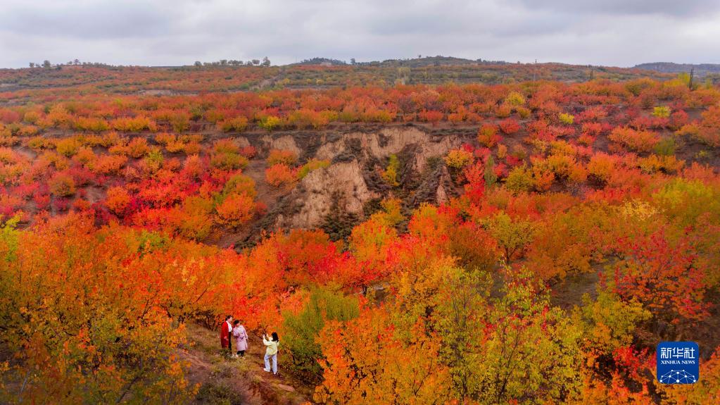 10月14日,游人在陕西省榆林市榆阳区古塔镇韩家梁村杏林园欣赏红叶(无人机照片)。