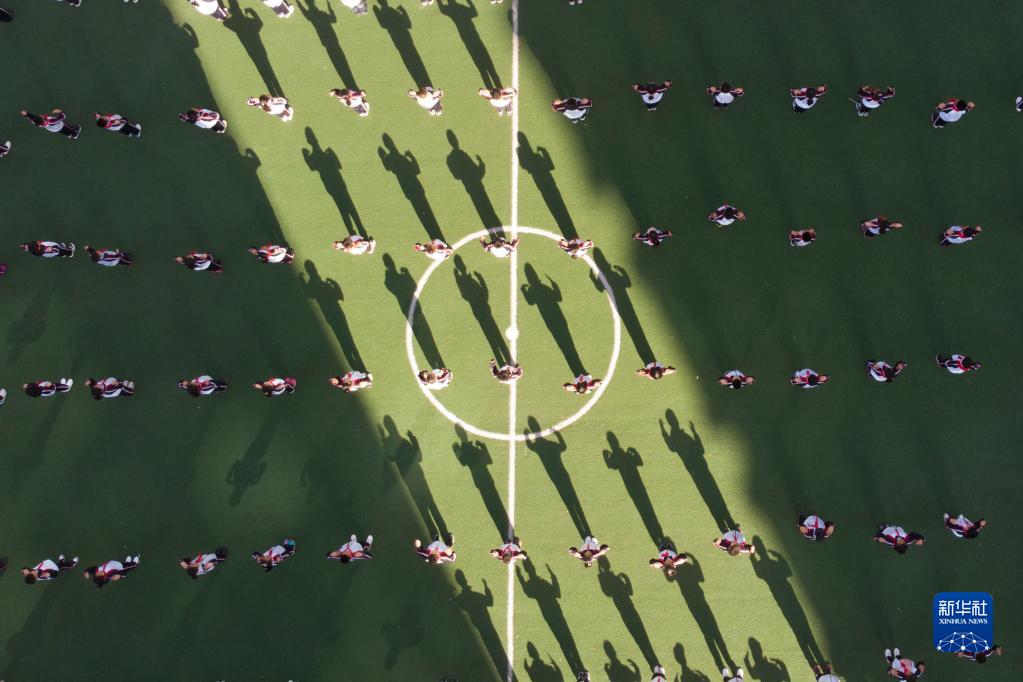 10月8日,哈尔滨市群力兆麟小学的学生在上课间操(无人机照片)。