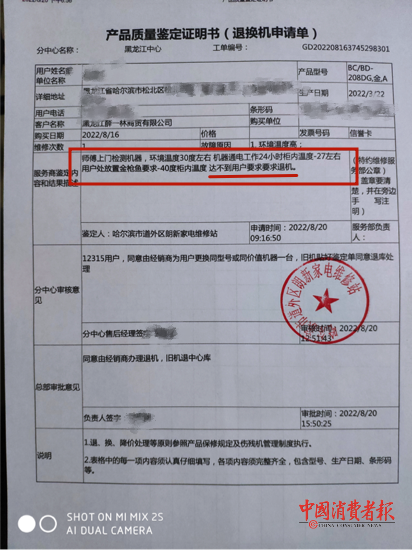 8月22日,澳柯玛哈尔滨售后给杨先生提供了一份由哈尔滨道外区一家家电维修站出具的《产品质量鉴定证明书(退换机申请单)》,服务商鉴定内容和结果这样描述:“环境温度30度左右,机器通电工作24小时,柜内温度-27℃左右,用户处放置金枪鱼要求-40℃柜内温度,达不到用户要求。”