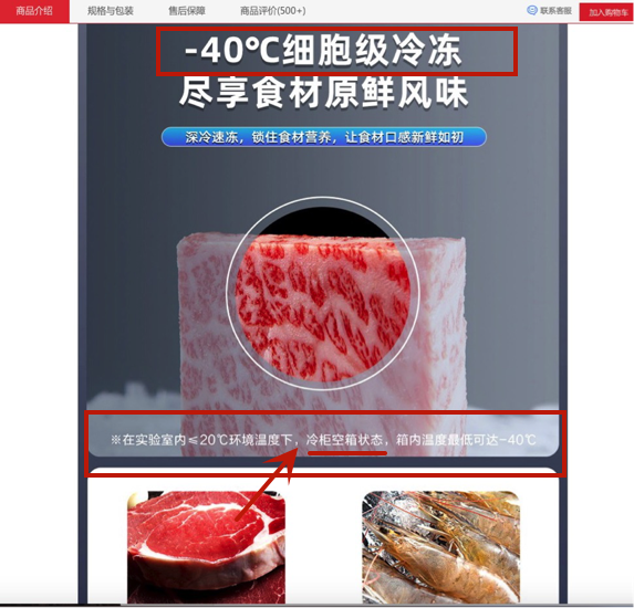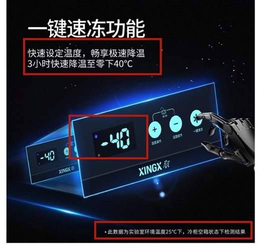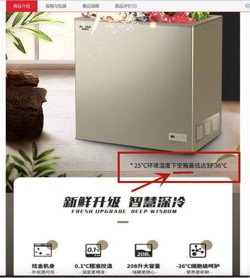 ▲星星冰柜宣称“3小时快速降温至零下40℃”,并称“此数据为实验室环境温度25℃下,冷柜空箱状态下检测结果”。