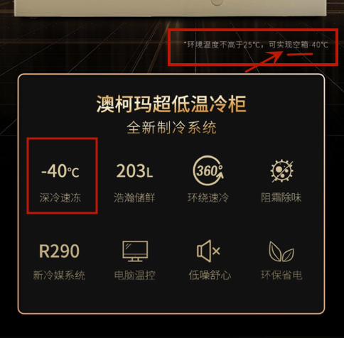 宣传海报小字提示,要达到-40℃,必须“在实验室内≤20℃环境温度下,冰柜空箱状态 ,箱内温度最低可达-40℃ 。”
