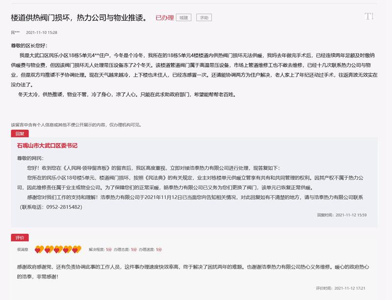 对此,该网友又一次留言,“感谢政府感谢党,还有负责协调此事的工作人员,这件事办理速度快效率高,终于解决了困扰两年的难题。也谢谢浩泰热力有限公司热心义务维修。非常感谢!”