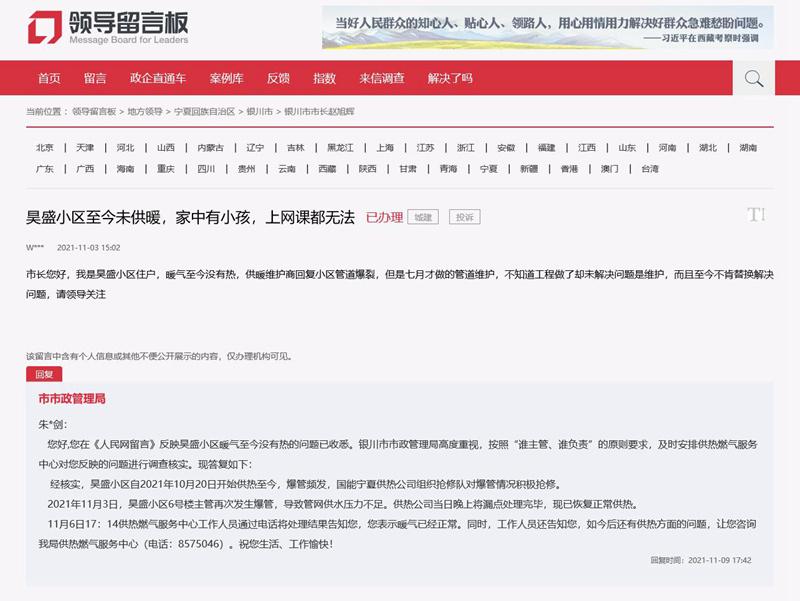 对此,银川市市政管理局公开回复称,“经核实,昊盛小区自2021年10月20日开始供热至今,爆管频发,国能宁夏供热公司组织抢修队对爆管情况积极抢修。11月3日,昊盛小区6号楼主管再次发生爆管,导致管网供水压力不足。供热公司当日晚上将漏点处理完毕,现已恢复正常供热。随后供热燃气服务中心工作人员通过电话将处理结果告知您,您表示暖气已经正常。”
