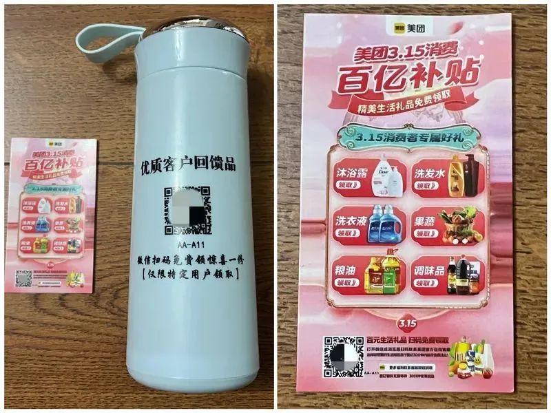 杯子上写着“优质客户回馈品”,并附有二维码,声称“微信扫码免费领取惊喜一份(仅限特定用户领取)”;卡片上写着“美团3.15消费百亿补贴,精美生活礼品免费领取”以及沐浴露、洗发水、果蔬等产品的照片,同样配有一个二维码,表示“扫码免费领取”。