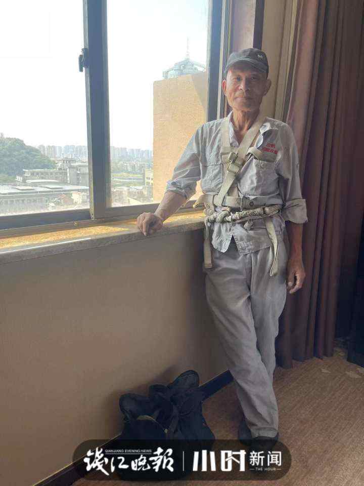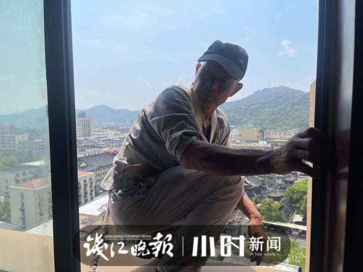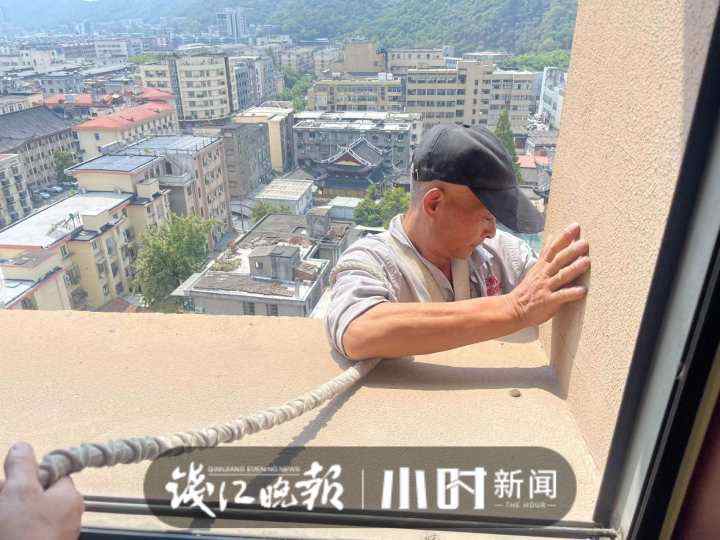 杨建国捆绑好安全带,紧靠窗边,双手一撑上了窗台,大声嘱咐着同伴:“小心,帮我把绳子抓牢。”