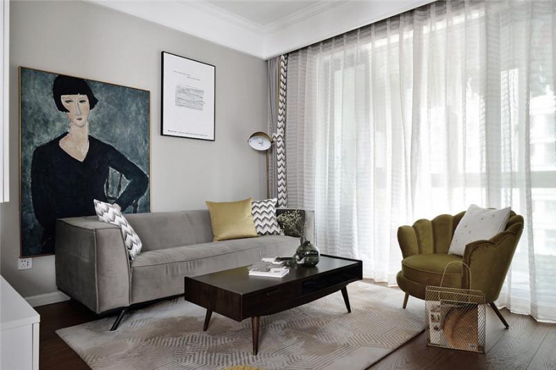 灰色布艺沙发、木质矩形茶几、与空间色调相呼应的地毯、白色薄沙落地窗帘,再配一把独特造型姜黄色的单椅,空间简约且极度舒