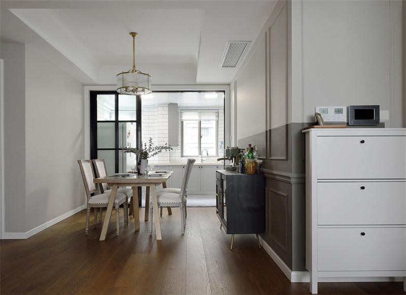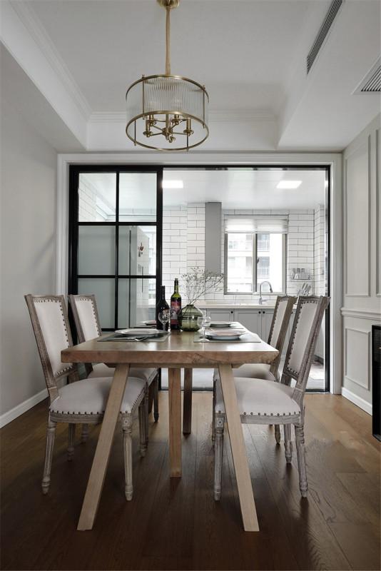 通往厨房之门,特别用规整有度的块型玻璃推拉门来识别,推开门,一边是厨房,一边是餐厅。玻璃门的结构,使得空间敞亮通透,充满现代感。
