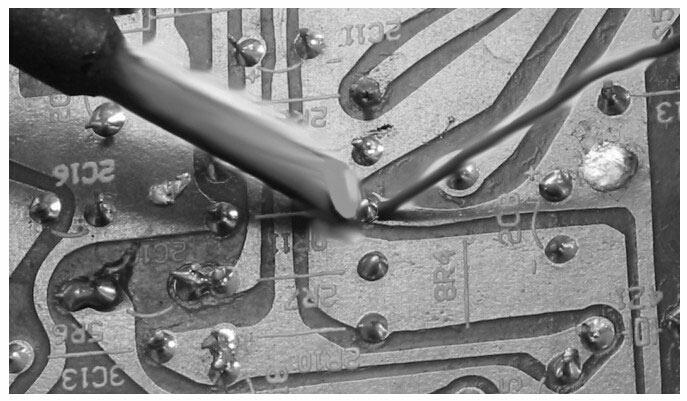 焊接元器件时,首先要将待焊接的元器件引脚上的氧化层轻轻刮掉,然后给电烙铁通电,发热后蘸上松香,当烙铁头温度足够时,将烙铁头以45°角度压在印制电路板待焊元器件引脚旁的铜箔上,然后再将焊锡丝接触烙铁头,焊锡丝熔化后成液态状,会流到元器件引脚四周,这时将烙铁头移开,焊锡冷却就将元器件引脚与印制电路板铜箔焊接在一起了。