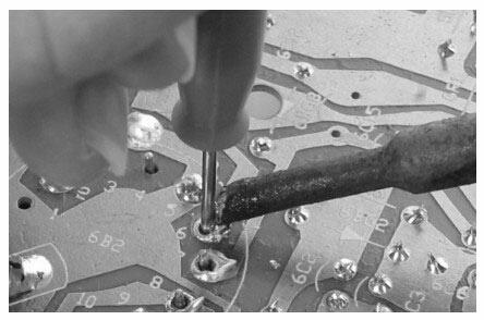 在拆卸印制电路板上的元器件时,用电烙铁的烙铁头接触元器件引脚处的焊点,待焊点处的焊锡熔化后,在电路板另一面将该元器件引脚拔出,然后再用同样的方法焊下另一引脚。这种方法拆卸3个以下引脚的元器件很方便,但拆卸4个以上引脚的元器件(如集成电路)就比较困难了。