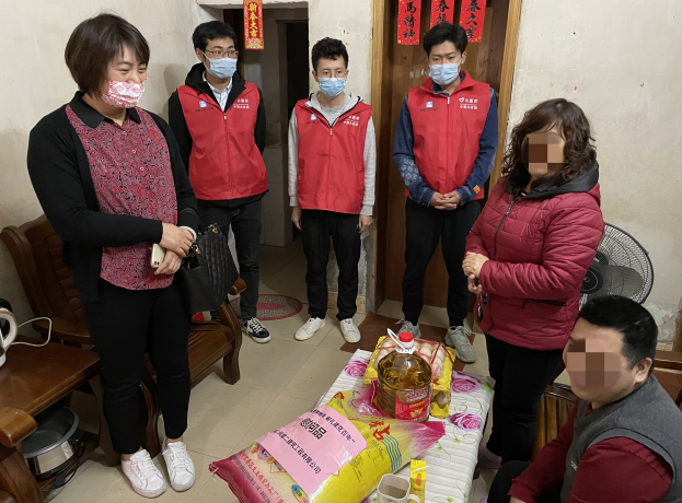 △肇庆万达项目中建二局二公司青年志愿者到困难家庭家中慰问,为他们送上油、米、蛋慰问物资。