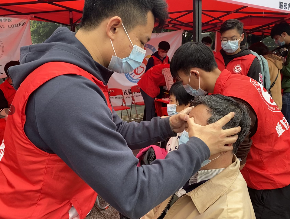 △赖同学正在为市民进行头部按摩。梁铮儿 摄