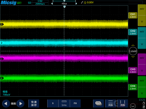 每通道噪声大概700uV左右,我这台第三通道一直有点小偏移,改天自动校准下试试能不能偏回来