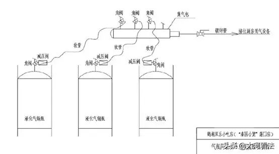 气瓶间南北向宽3.5米,东西向长6米。沿北墙由西向东依次放置冰箱一台、50Kg空瓶5只(编号为1#、2#、3#、4#、8#);沿南墙由西向东依次设置油水分离器一套、冰箱一台、50Kg液化石油气钢瓶3只(编号由南向北依次9#、6#、7#)。9#、6#、7#钢瓶中的液化石油气通过调压阀、燃气橡胶软管连接至集气包,由集气包向二楼厨房间送气。