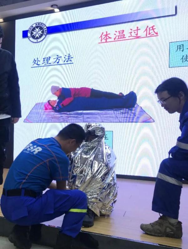 模拟户外用急救毯进行保温。来源:无锡蓝天救援队
