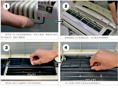 tcl 变频空调 在家怎么拆洗?取出空调过滤网:清洗之前需断开空调电源,打开前面板的扣住面板突出部(左右二处),将面板打开到面板停开的位置,约60度,然后抽出空气过滤网稍向上提起空气过滤...