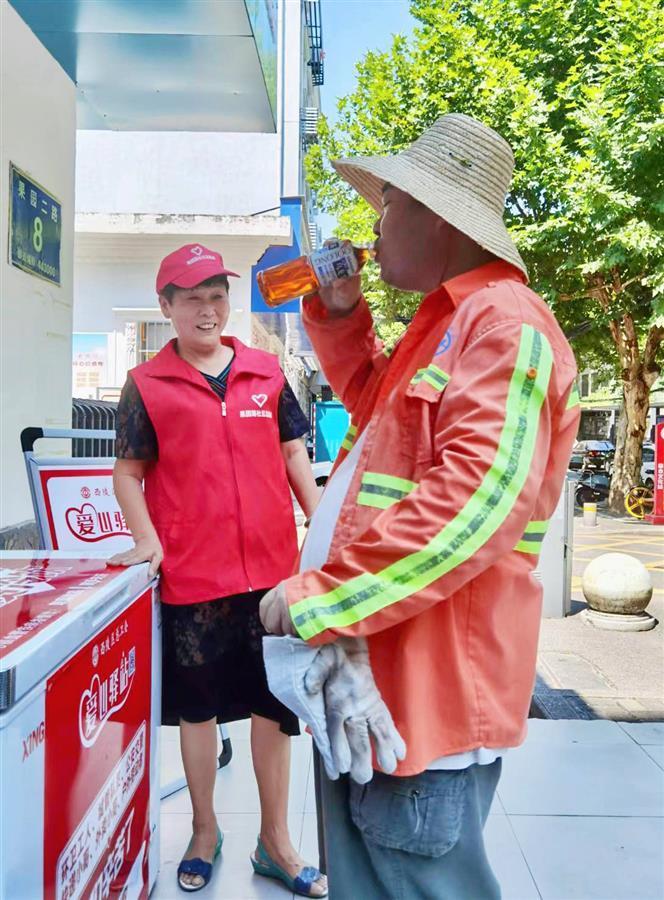 8月7日,在果园路社区门口,一个爱心冰柜亮相街头。记者现场看到,在志愿者的招呼下,环卫工人、外卖小哥停下脚步,品免费冰饮,休息聊天。“天气确实热,在这里喝点水、休息一下,蛮安逸。”在附近工作的环卫工人陈师傅说。