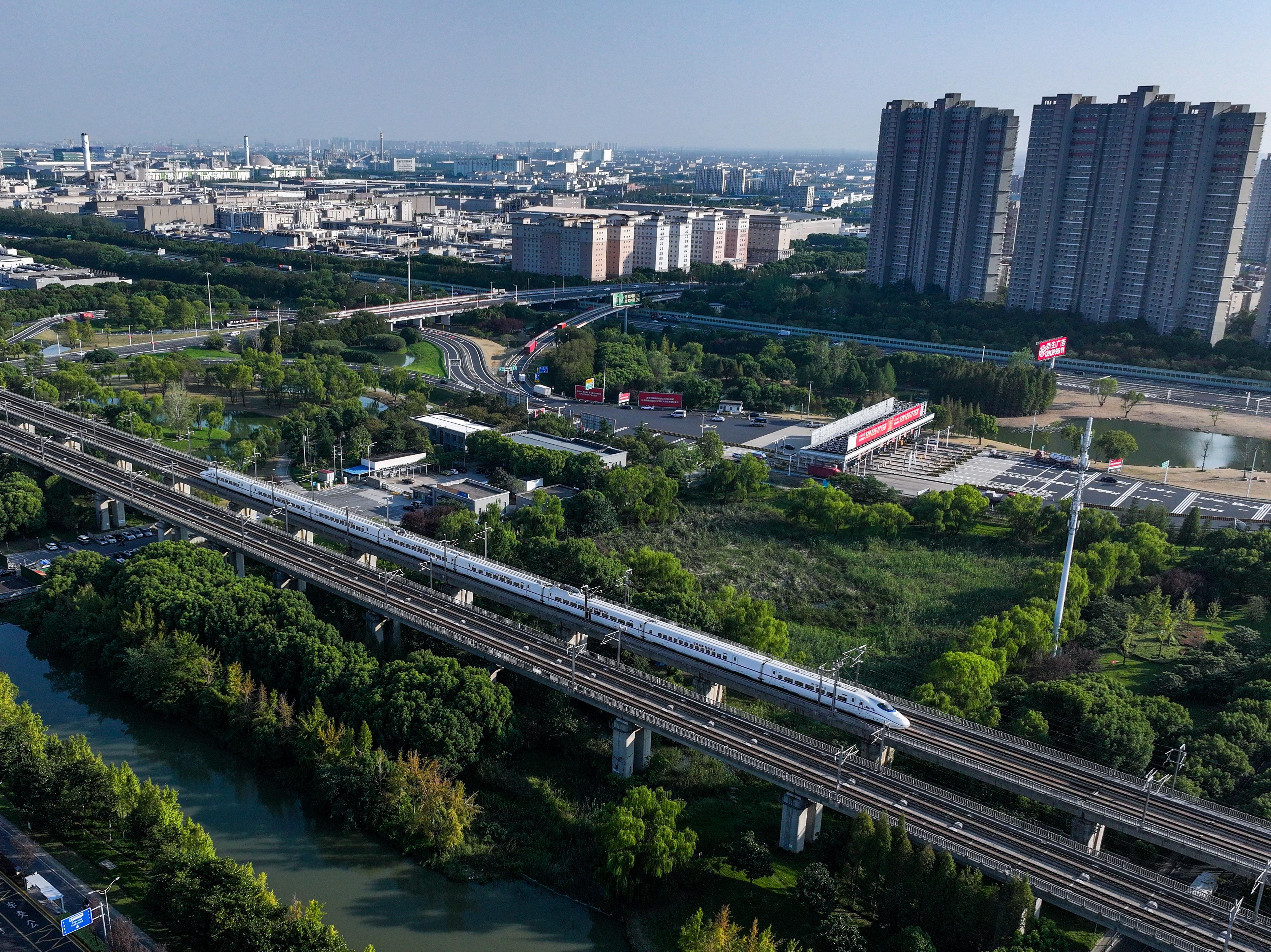 高铁列车从昆山城区经过(10月9日摄,无人机照片)。 新华社记者 李博 摄